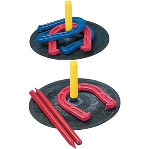 The Champion Sports Rubber Horseshoe Set is a lighter alternative to steel horseshoe sets. A great test of aim and accuracy, this lawn game is a fun addition to you backyard or P.E. equipment closet. Each set includes 2 rubber mats with stakes and 2 plastic stakes, so you can choose to play indoors or out. The 4 rubber horseshoes come in two different colors for two-player contests.